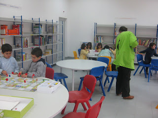 Os alunos da turma B, do Jardim de Infância, foram os primeiros a conhecer a nova disposição da biblioteca. Estes meninos ouviram duas histórias: "Orelhas de borboleta" e "Amélia quer um cão" no espaço da Hora do Conto e depois foram redescobrir os livros e jogos da biblioteca.